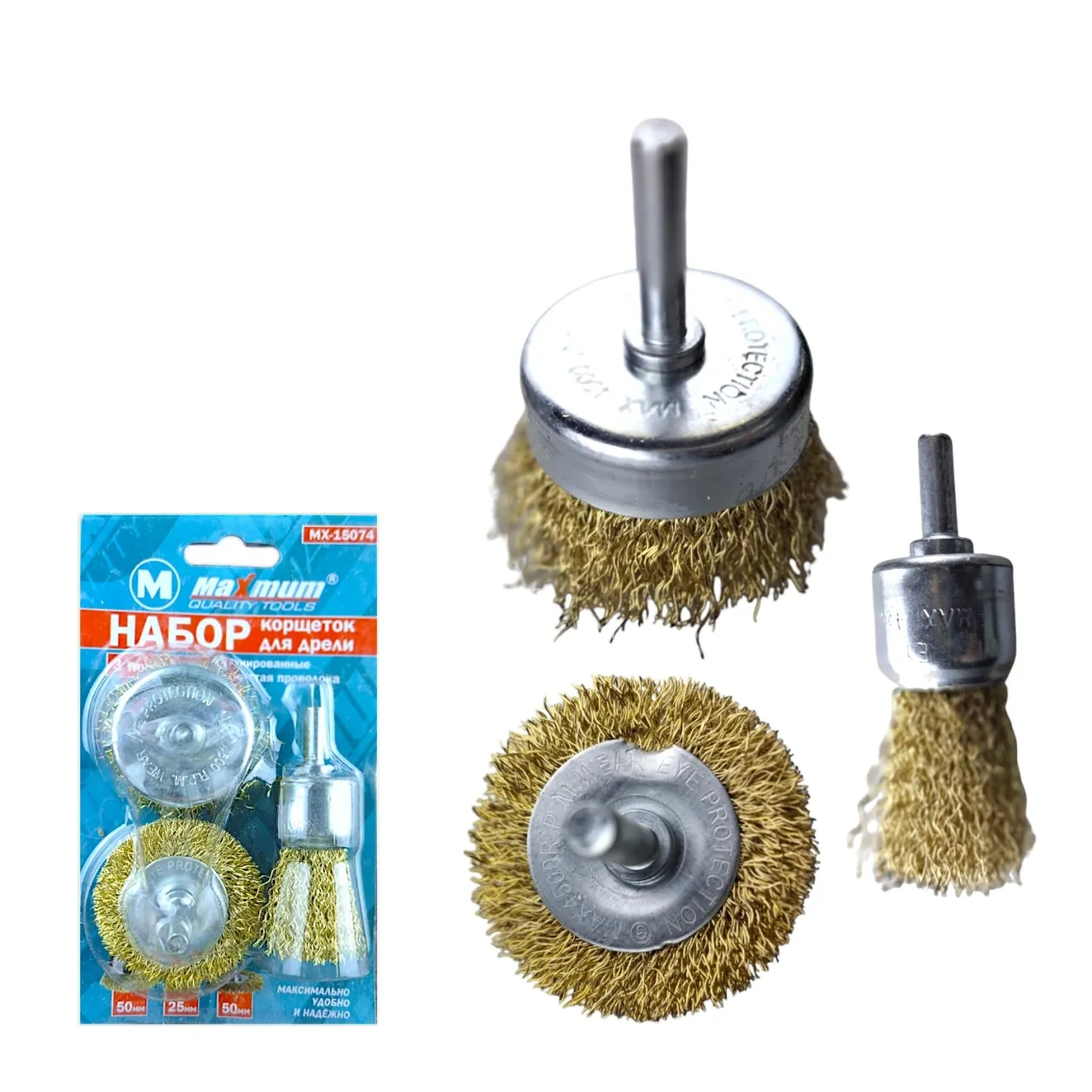 Набор латунированных корщеток для дрели круговых от "Maximum Quality Tools" выполнен из латунированной проволоки 0,3 мм и имеет цилиндрический хвостовик. Насадки для дрели и шуруповерта используются для зачистки поверхностей сложных форм от лакокрасочных покрытий, ржавчины и других загрязнений перед процессом покраски. Щетина изготовлена из высококачественной стали. Корщетки по металлу предназначены для работ лёгкого и среднего уровня сложности в труднодоступных местах, например, в углах.