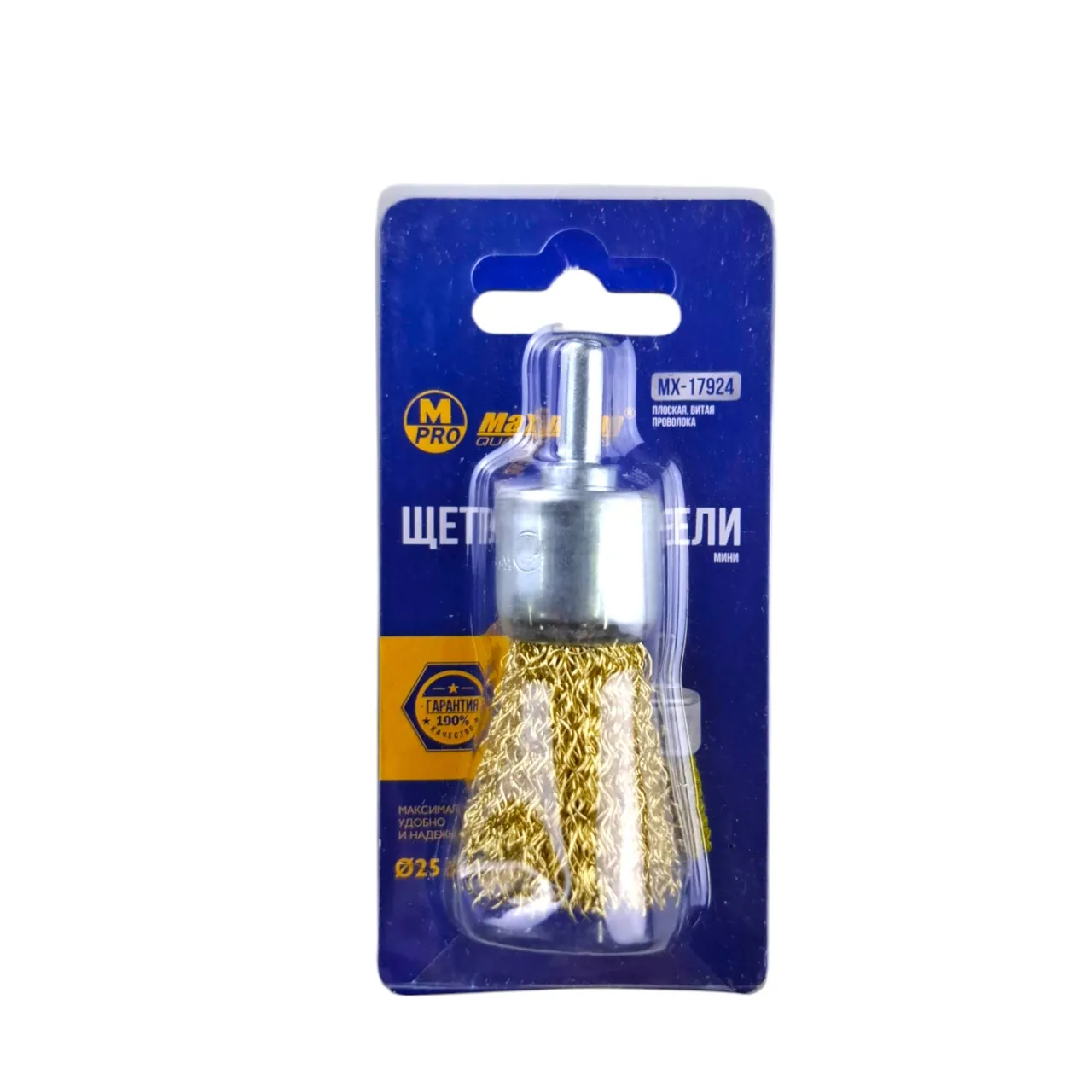 Это чашечная щетка с проволочной щетиной из латуни 25 мм от "MAXIMUMQUALITYTOOL". Латунированная щетка крепится на дрель или шуруповерт через резьбовую шпильку и предназначена для более специфичных задач, чем нейлоновая.