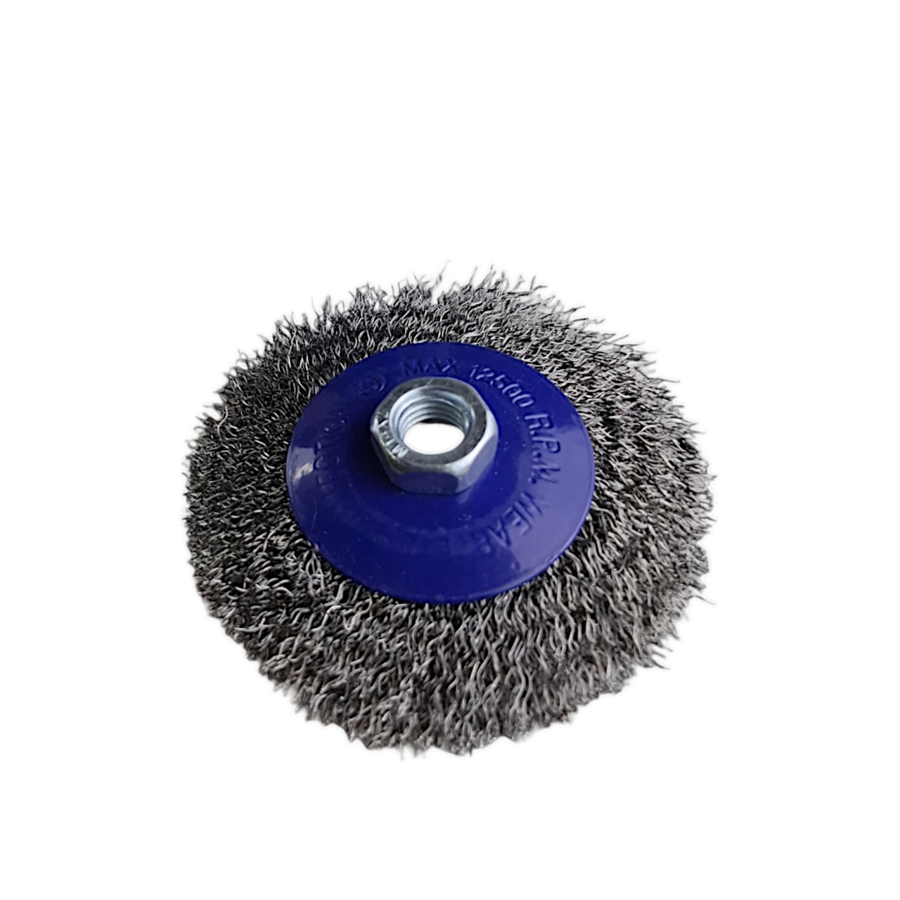 Качественная чашечная щетка с волнистой щетиной 4" оптимальная для деликатной, но эффективной очистки металла от ржавчины, краски и загрязнений. Она менее агрессивна, чем щетки с прямой щетиной, и подходит для подготовки поверхностей под покраску, где важно не оставить глубоких царапин.