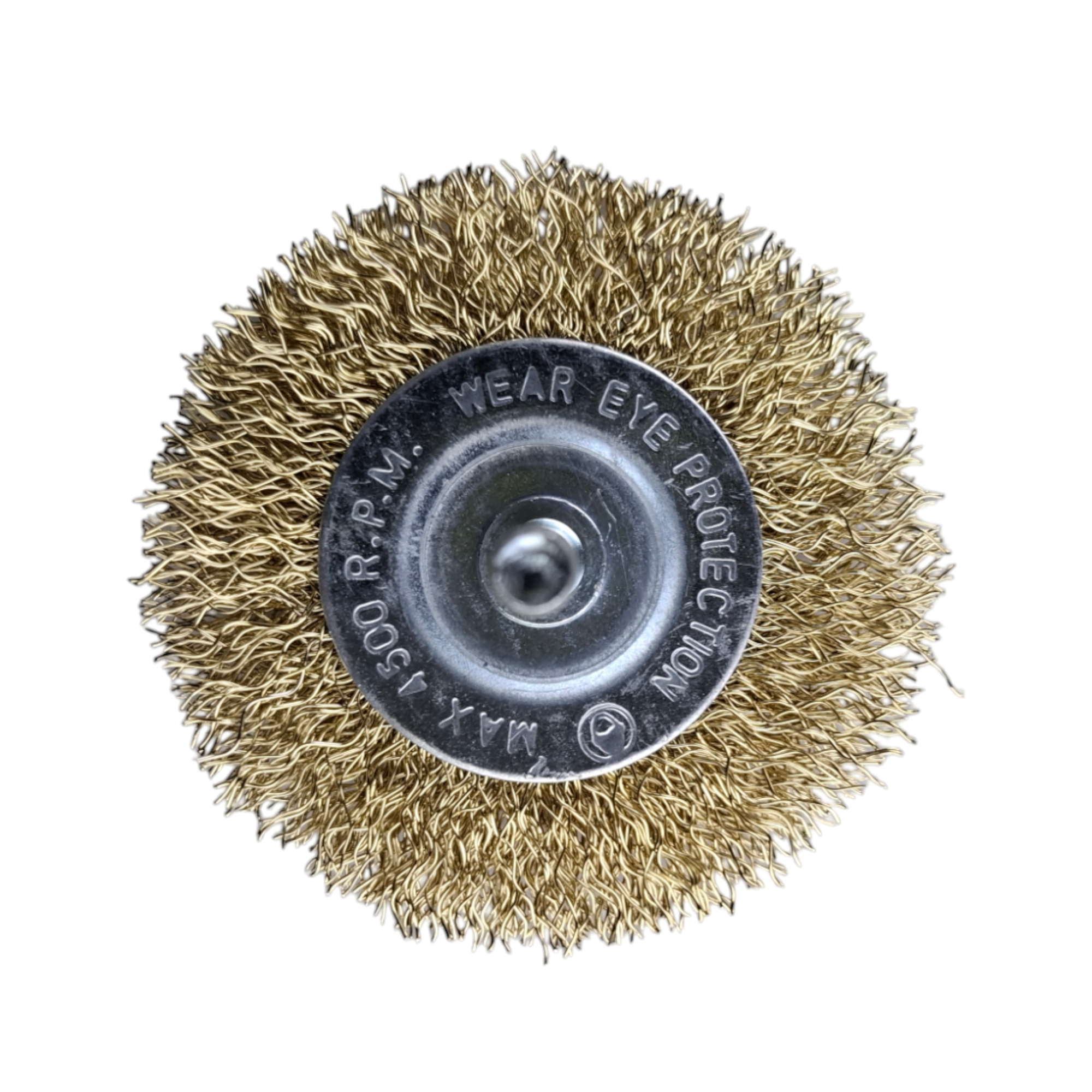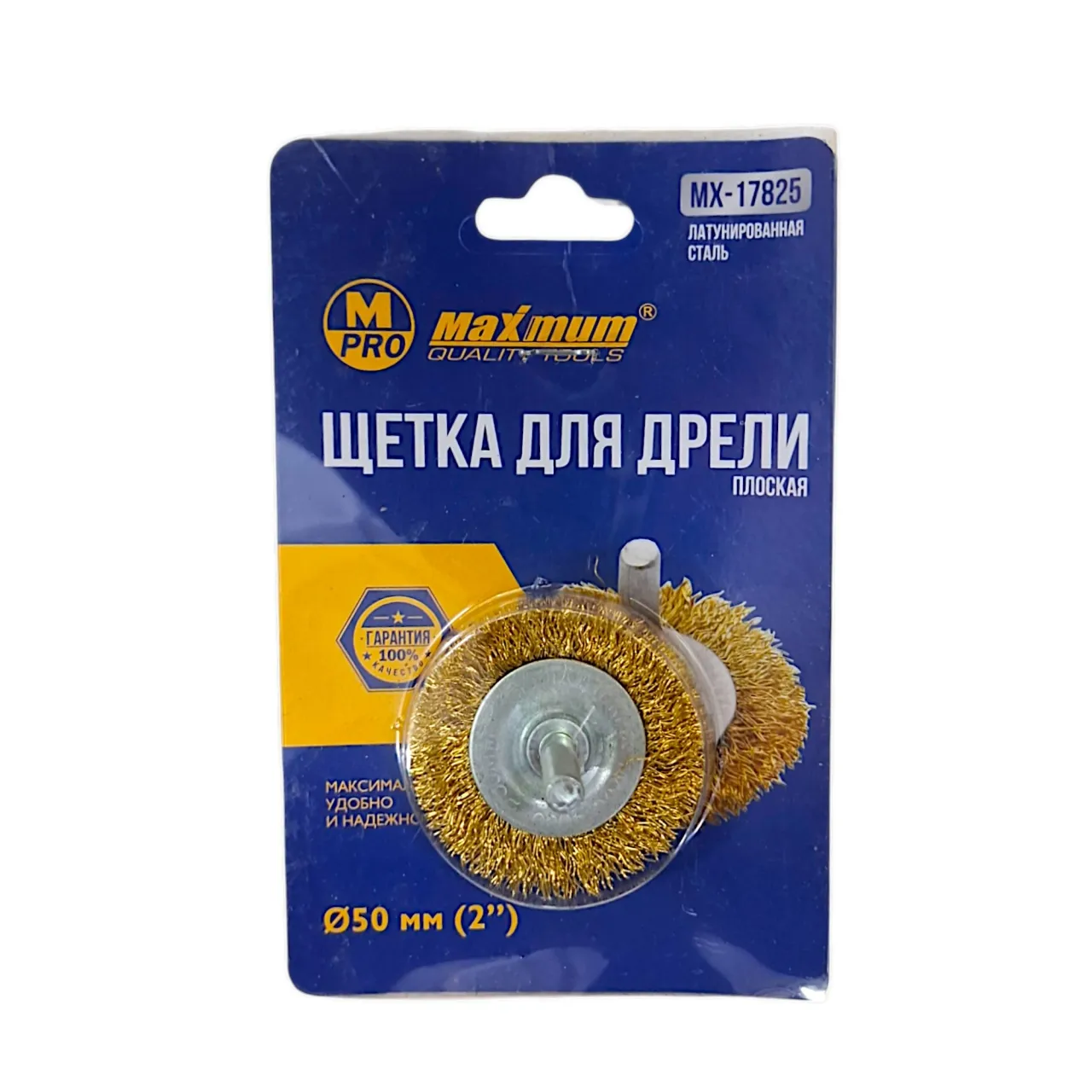 Плоская щетка с проволочной щетиной из латуни 50 мм от "MAXIMUM QUALITY TOOLS" крепится на дрель или шуруповерт через резьбовую шпильку.